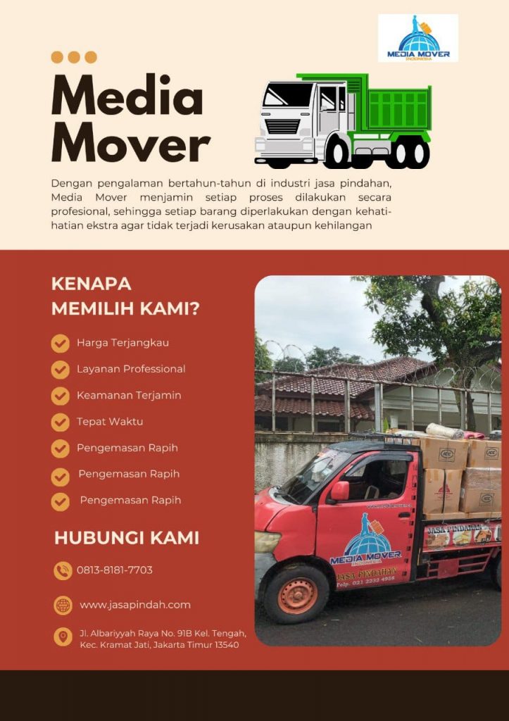 Media Mover adalah perusahaan Jasa Pindahan yang sudah berdiri sejak tahun 2013 yang berlokasi di Jakarta Timur yang memberikan pelayanan Pindahan All in Full Service dan terima beres.